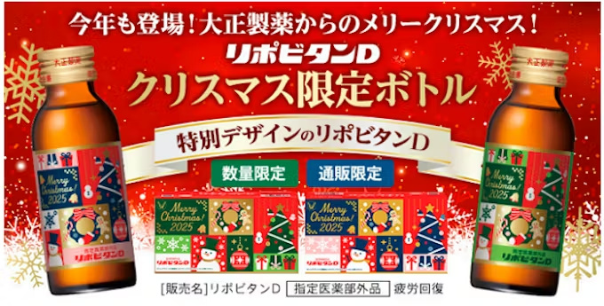 大正製薬は、今年のクリスマスを心待ちにする期間を応援する「リポビタンD クリスマス限定ボトル 2025」を11月18日から、数量限定、通販限定で同社通販サイト「大正製薬ダイレクト」等で販売を開始する。