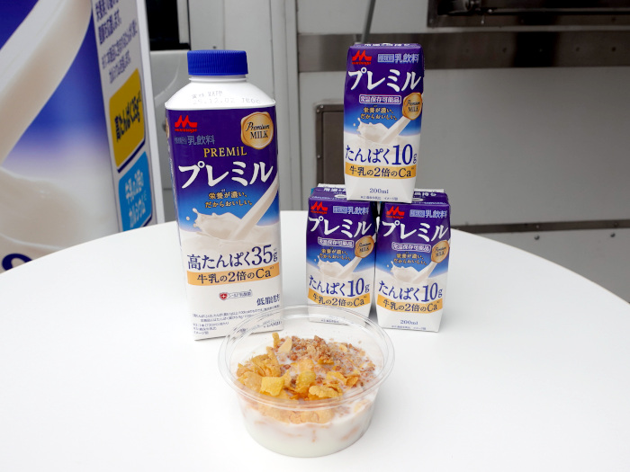 「『プレミル』は、たんぱく質と一緒に効率よくカルシウムも摂取できるだけでなく、当社の独自の機能性素材で健康力をサポートする『シールド乳酸菌』も配合している」と、たんぱく質、カルシウム以外の栄養素も摂取できるのだと紹介する。「また、牛乳と違って、常温保存も可能。外出中などでも手軽に摂取することができる」と、持ち運びに便利な200mlも展開しているのだとアピールする。「『プレミル』の飲用摂取だけでなく、シリアルと一緒に摂取するなど、朝食に最適な摂取方法も提案していくことで、日々忙しい現役世代の朝食の栄養バランスを少しでも改善できればと考えている」と、幅広い世代に向けて、日々の健康維持に「プレミル」を活用してもらいたい考えを示していた。