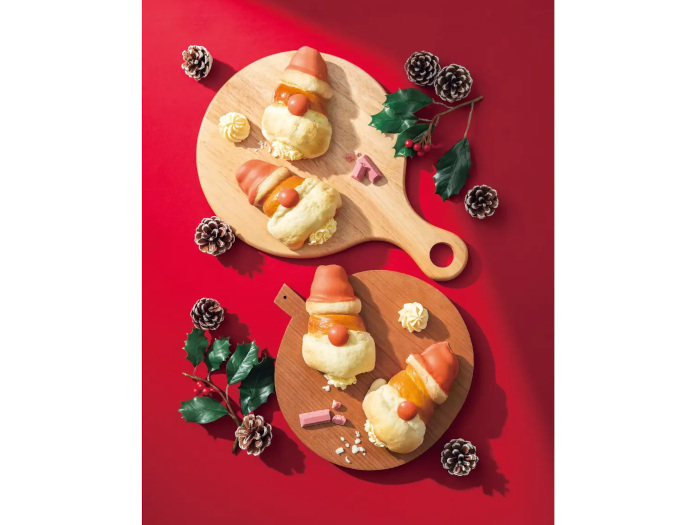 「季節のサンタコロネ」は、ゴディパンのコロネがサンタクロースの見た目になって登場。中身は、ストロベリーのソースやストロベリーチョコレート&ビスケットのバーに、カスタードとホイップを合わせたクリームが入って、クリスマスの定番であるストロベリーショートケーキをイメージした味わいに仕上げた。