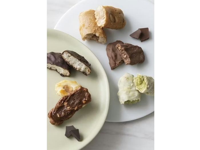 ひと口サイズの小さなあられとおせんべいを詰め合わせた。手のひらサイズのトレーの中に、甘いチョコレートでコーティングしたおせんべいとあられ、塩気の効いたあられなど、こだわりのおいしさを詰め込んで届ける。
