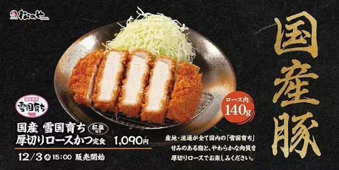 松屋フーズは、とんかつ専門店の「松のや」において、12月3日午後3時から、「国産雪国育ち厚切りロースかつ定食」を発売する。