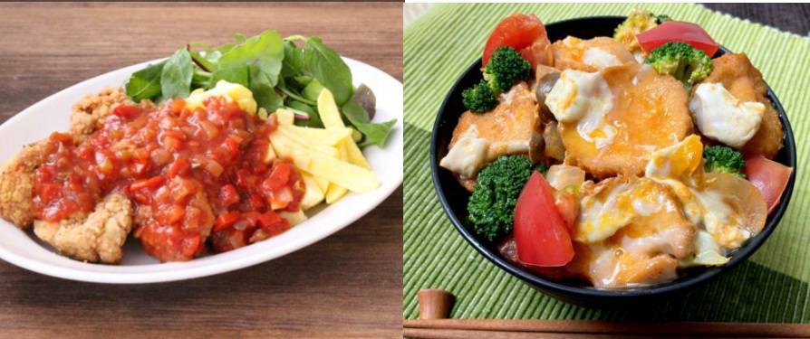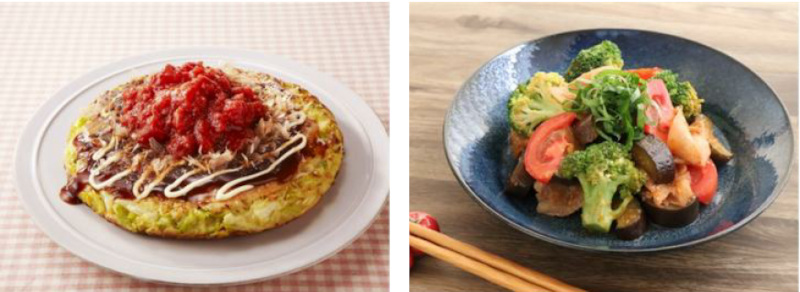 左から:トマトソースでイタリアンお好み焼き、熊本県産なすとトマトのケチャみそ炒め