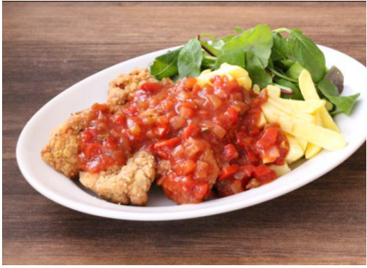 まず、減塩が難しい時におすすめなのが、ナトカリバランスメニューの「から揚げ&ポテト ぶっかけ野菜のサルサソース」と「チルド餃子で作る ラビオリ風グラタン」の2品。カゴメが実施した「全国一斉ナトカリ意識調査」によると、減塩を意識した食事を実施できない理由上位として「時間がないから」「好きなものを食べたいから」が挙がっていた。「から揚げ&ポテト ぶっかけ野菜のサルサソース」(食塩相当量3g/ナトリウム1184mg/カリウム1288mg)は、“味付けの塩分の計算が面倒”“時間がなくて気にしてられない”“味が濃くて美味しいメニューを食べたい”そんなときに取り入れたい、時短&がっつり食べられる一品となっている。野菜が不足しがちな揚げ物メニューにサルサで野菜をプラスできる。サルサのほのかな酸味と辛みで揚げ物もさっぱり食べることができる。なお、ポテトは塩を振らず、から揚げは成分表記載の栄養価を元に計算している。
