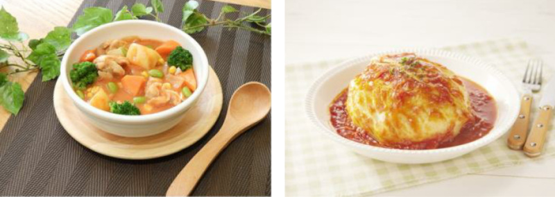 左から:枝豆とコーンのトマトクリームシチュー、トマトソースが3役!巻かないロールキャベツ