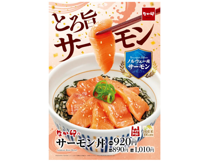 なか卯展開する丼ぶりと京風うどんの「なか卯」は、12月10日午前11時から、脂のりが良いノルウェー産サーモンを贅沢に使用した「サーモン丼」を販売する。