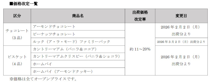 対象商品は、菓子商品7品で、改定率は約11~20%の値上げとなる。