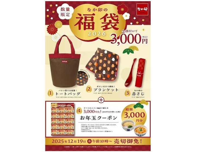 なか卯が展開する丼ぶりと京風うどんの「なか卯」は、12月19日午前10時から、オリジナルグッズとお得なクーポンが入った「なか卯の福袋」を全国のなか卯で数量限定販売する。