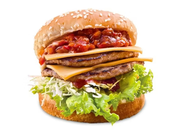 「アジアの旅人ケバブバーガー」は、具だくさんなトマトソースのうまみと、独自配合の特性スパイシーマヨソースが決め手のケバブ風バーガー。パティ2枚とチェダーチーズ2枚でボリューム満点の、異国情緒あふれる本格的な味わいに仕上げた。