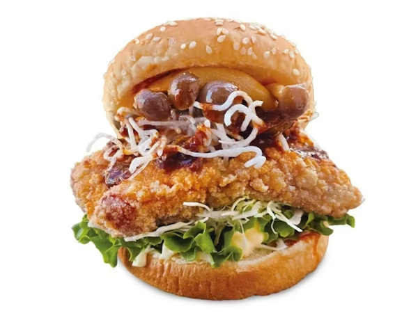 「麻辣湯ショックバーガー」は、ジューシーでサクサクに揚がった鶏唐揚げに、しめじと揚げ春雨の食感をプラスした。花椒(ホアジャオ)の刺激的なシビレが癖になる、麻辣ソースでいただく新感覚の中華風バーガーとなっている。