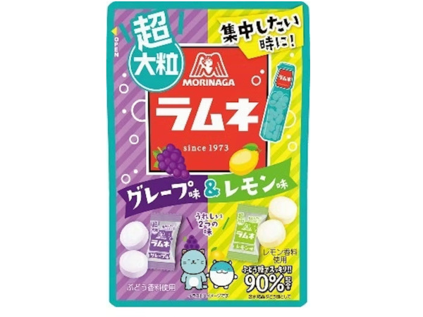 「超大粒ラムネ<グレープ&レモン>」は、大粒ラムネよりさらに大きい「超」大粒のラムネ。グレープ味・レモン味の2種入り。ぶどう糖を90%配合(含水結晶ぶどう糖として)した。