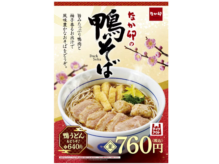なか卯が展開する丼ぶりと京風うどんの「なか卯」は、12月17日午前11時から、年越しの時期の定番商品「鴨そば」を販売する。