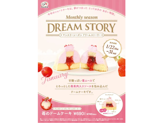 不二家洋菓子店では、2022年にショートケーキ発売100周年を記念し、「ショートケーキ12の物語」と題して毎月22日に特別なショートケーキを発売、以来2025年までさまざまな物語を紡いできた。そして来年はショートケーキにさらなる驚きを付け加えた商品「Monthly season DREAM STORY(マンスリーシーズン ドリームストーリー)」を展開する。テーマは「夢がつまったとっておきのあまい物語」。食べたときの味わい、香り、見た目など、まるで“夢の時間”のようなひとときを届けるスイーツを、月替わりで毎月22日のショートケーキの日に合わせて発売する。