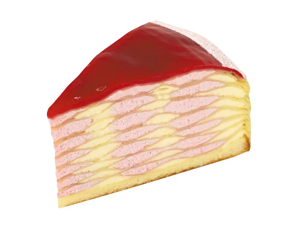 「埼玉県産あまりんのダブルミルクレープ」は、クレープ生地に埼玉県産のブランド苺「あまりん」のクリームと軽いタイプのカスタードクリームを絞り、格子状に重ねた。上面のあまりんソースがアクセントになっている。アーガイル柄が可愛い不二家ならではのミルクレープだという。
