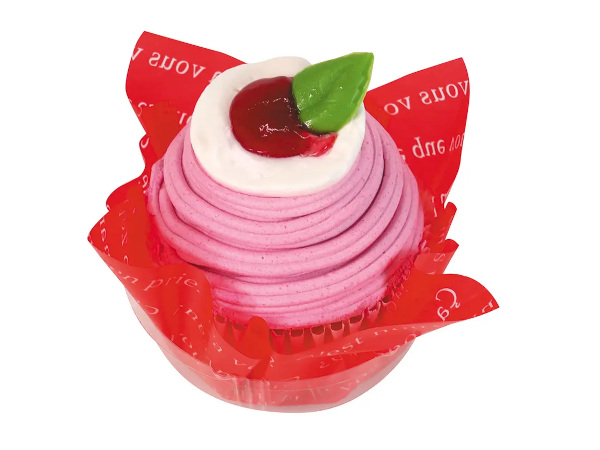 「栃木県産とちあいかのモンブラン」は、軽いタイプのカスタードクリームを中にしのばせたスポンジに、とちあいかクリームと苺風味クリーム、シャンテリークリームを重ねた。上面のとちあいか苺ソースがアクセントの、ピンク色の可愛らしいモンブランになっている。