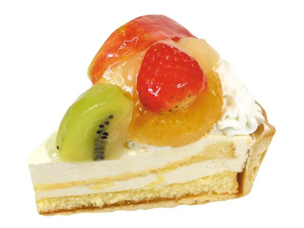 「苺とフルーツのカスタードパイ」は、軽いタイプのカスタードクリームとスポンジを重ね、上面に苺を中心に、りんご、キウイ、白桃・こゆずのシロップ漬けを彩り豊かに飾った贅沢感のあるパイ。パイ生地にしのばせた甘酸っぱい杏ジャムがフルーツの甘さを引き立てる。