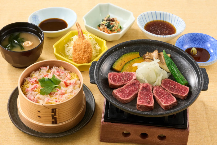 「牛みすじステーキと本ずわい蟹のせいろ御飯膳」は、牛みすじの陶板ステーキ・本ずわい蟹のせいろ御飯・紅ずわい蟹爪フライ・小鉢の内容。希少部位・牛みすじの陶板ステーキが味わえる、年末年始らしく蟹も牛も両方楽しみたい人にぴったりの豪華御膳になっている。