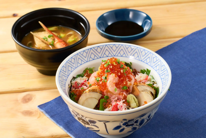 「本ずわい蟹と帆立の七彩海鮮丼」は、海鮮丼は本ずわい蟹、北海道産帆立をはじめ、7種の具材を豪快に盛り付けた年末年始仕様とのこと。八丁味噌(八丁味噌45%使用(味噌に占める割合))の蟹汁も選べて海鮮づくしのセットになっている。