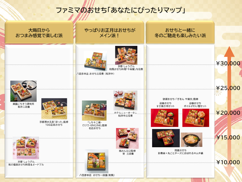 今回、消費者のおせちに対するニーズに沿って、おすすめのおせちを提案する、ファミマのおせち「あなたにぴったりマップ」を作成した。ファミマのおせち「あなたにぴったりマップ」は、おせちを「大晦日からおつまみ感覚で楽しむ派」、「やっぱりお正月はおせちがメイン派!」、「おせちと一緒に冬のご馳走も楽しみたい派」という3パターンのおせちの楽しみ方に沿って価格別にファミマのおせちを配置したマップとなる。