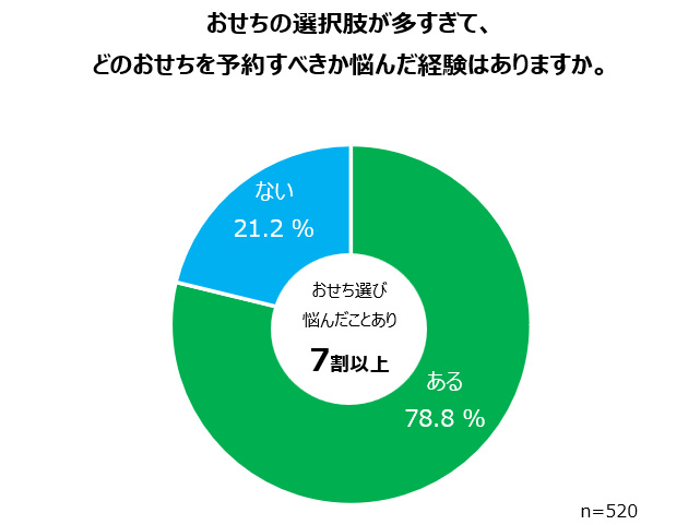 ファミリーマートが行った調査で、「おせちの選択肢が多すぎて、どのおせちを予約すべきか悩んだ経験があるか」を尋ねたところ、「はい」と答えた人が7.8割となっており、多くの人がおせち選定において迷いを感じていることが明らかとなった。一人ひとりのニーズに寄り添い、最適なおせちを提案する「あなたにぴったりマップ」で、おせちを通じてより満足度の高い年末年始を過ごしてほしい考え。