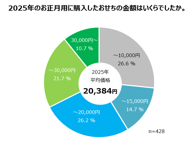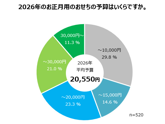 ファミリーマートが行った調査で、「2025年のおせちの購入金額」と「2026年のおせちの予算」を尋ねたところ、2025年のおせちの購入金額の平均は2万384円、2026年のおせちの予算は2万550円となった。全体では昨年から+166円と微増にとどまったものの、「~1万円」「~1万5000円」と回答した方は3.1%上昇しており、おせちの予算は維持する人が多い一方、物価の高騰が続く中で、値頃感のあるおせちを選びたいというニーズも高まってきている。