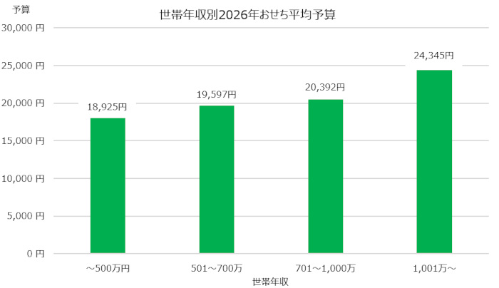 また来年のおせちの予算を世帯年収別に見ると、「500万円以下」の家庭は1万8925円、「501万円~700万円」の家庭は1万9597円、「701万円~1000万円」の家庭は2万392円、「1001万円以上」の家庭は2万4345円となり、世帯年収が高いほどおせちにかける金額が高いことがわかった。「1001万円以上」の家庭は豪華なおせちや高級食材を選ぶ傾向がうかがえる。