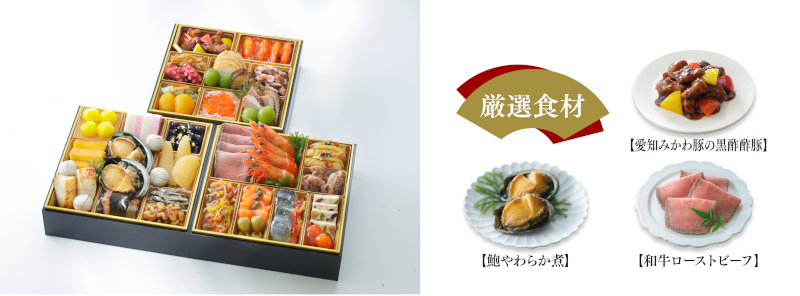 「八百彦本店 おせち三段重(和洋中)」は、多彩な味わいの和洋中三段重に、鮑(あわび)や和牛ローストビーフ、愛知みかわ豚の黒酢酢豚などプレミアム食材をふんだんに盛り込んだ。