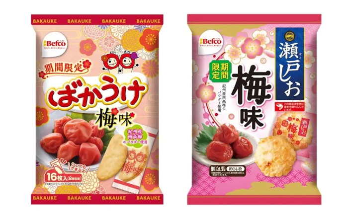 栗山米菓、「ばかうけ」「瀬戸しお」から紀州産南高梅の香りと酸味を生かした季節限定フレーバーを“梅味”を発売