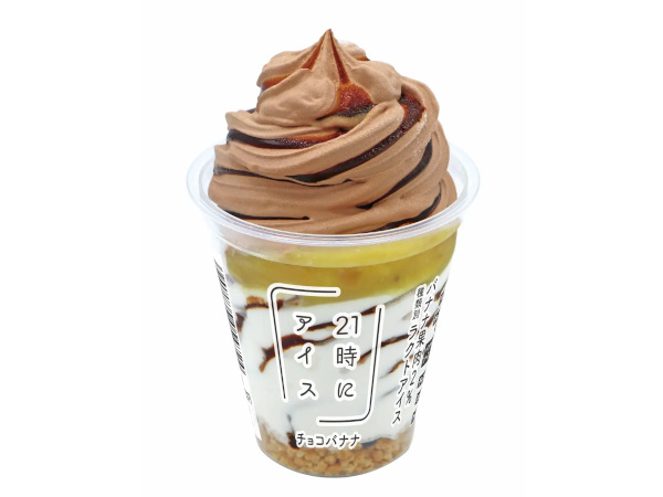 「21時にアイス チョコバナナ」は、スッキリしたミルクアイスと濃厚チョコアイスの2種の味わいに、果肉入りバナナソースとアイス全体にかかるチョコソースが絶妙に絡み合い、専門店の味を表現した。2種のトッピングと底のクッキーがアクセントとなり、最後まで飽きずに楽しめる。