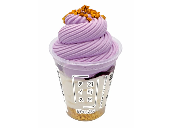 「21時にアイス 紫芋モンブラン」は、21時にアイスの人気上位フレーバー「紫芋モンブラン」を、天面の巻き形状で表現した。スッキリしたミルクアイスと濃厚な紫芋アイスの2種の味わいに、紫芋ペーストを配合した紫芋ソースがよく絡み、素材本来の濃厚な味わいを楽しめる。