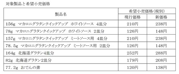 対象製品カテゴリーは、グラタンとおでんの素で、改定内容は小売価格を約13%~約17%値上げする。
