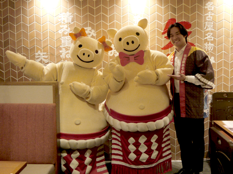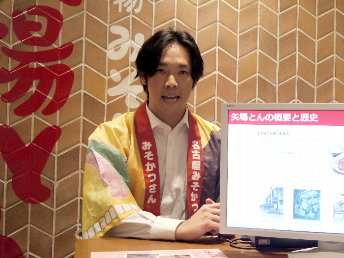 矢場とんは、1947年の戦後間もない頃に名古屋で創業し、小さな屋台からその歴史が始まった。「当時、名古屋の屋台で、一人の客がつまみで食べていた串かつを“どて鍋”(もつの豆味噌煮込み)のたれに浸して食べていたのを、たまたま居合わせた初代店主の鈴木義夫が試してみたことが、矢場とんの『みそかつ』が生まれるきっかけだった」と、矢場とん誕生のルーツを語るのは、名古屋みそかつ大使「みそかつさん」こと、同社 総務部 広報グループリーダーの片山武士氏。「2005年に開催された『愛・地球博』から巻き起こった名古屋めしブームに乗って、全国に店舗を拡大。現在では、愛知・三重・東京・大阪・富山に国内計31店舗(持ち帰り専門店含む)、さらに海外1店舗(台湾)を展開している。矢場とんの年間来店数は約350万人に達し、特に矢場町の本店では休日は長い行列ができている」と、今では名古屋名物として多くの人に愛されているとアピールした。