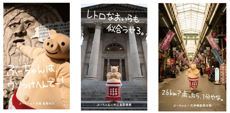 巨大屋外交通広告に掲出されているピールオフクーポンカードには、出張中の「ぶーちゃん」が実際に大阪の観光名所で撮影したオリジナルビジュアルを採用。新世界やてんしば、天神橋筋商店街、中之島図書館など、大阪を象徴するスポットで撮影した全20種類のカードには、「レトロなおいらも似合うやろ」「見えてきた、大阪で人気者になる道が」など、「ぶーちゃん」らしいユニークなメッセージを添えており、来街者がつい持ち帰りたくなるデザインに仕上げている。