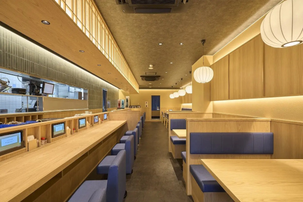 店舗デザインにおいては、シンプルに和を表現したモダンなデザインで食事への新たな期待感を演出する。入口からの店内の視認性を向上、食事の時間の快適さと心地良さを上げるためテーブルサイズ・カウンター席の間隔の見直し、ファミリーなどグループにも対応できるベンチシートやBOX席などを設置。さらに和を意識した素材の照明やテーブルの自然な木目の温かみで、落ち着きと親しみを感じてもらえるデザインとした。