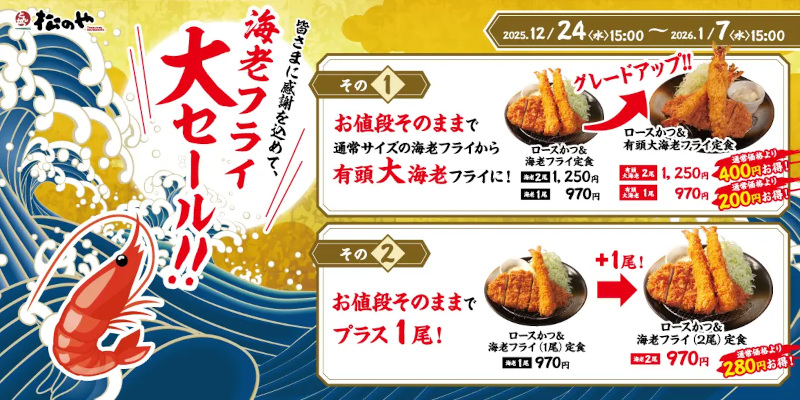 松屋フーズは、とんかつ専門店の「松のや」において、12月24日午後3時から、「海老海老フェア」を開催する。