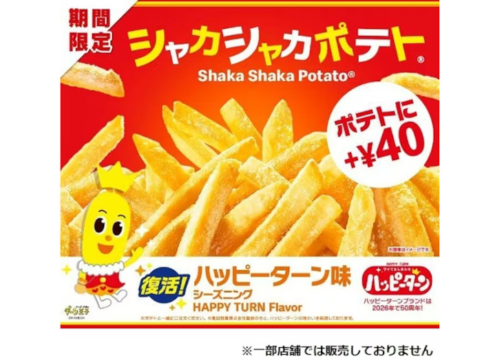 「マックフライポテト」は、長年多くの消費者に支持されているマクドナルドの人気メニューの1つ。じゃがいもは世界でも限られた品種のみを使用し、丸ごとカットした、外はカリッとゴールデンブラウン、中はホクホクとした食感が特長で、食べた人が笑顔になる、お腹も心も幸せになるサイドメニューとなっている。そんな多くの人々に愛される「マックフライポテト」に味付けをして、シャカシャカ楽しみながらおいしく味わえる「シャカシャカポテト」に、昨年シャカシャカポテト史上初となる企業コラボレーションとして好評を得た“ハッピーターン味”が期間限定で復活、再登場する。