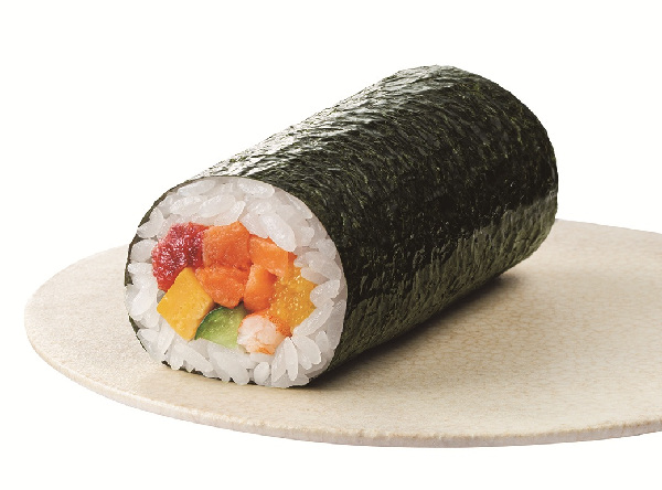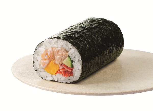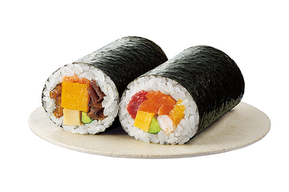 「海鮮恵方巻」は、漬けサーモンや本まぐろ入りまぐろたたき身、海老など人気の海鮮具材が詰まった恵方巻。今回から手巻海苔へ変更し、パリパリとした食感を楽しむことができる。