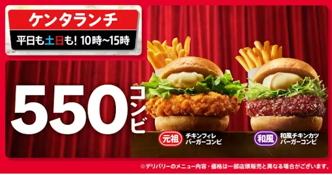 日本ケンタッキー、毎日10時から15時まで提供の「ケンタランチ」にバーガーがポテトと一緒に楽しめる「550コンビ」を販売