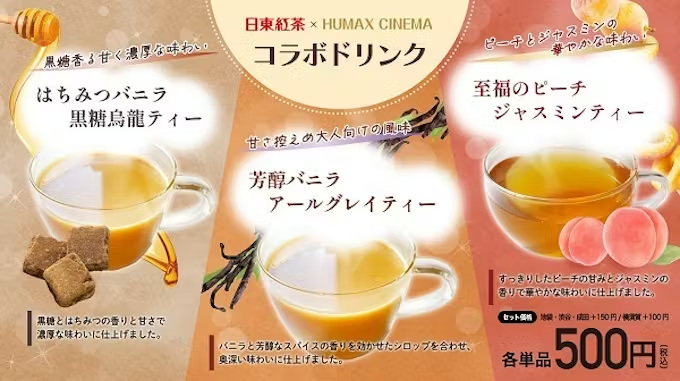 三井農林、日東紅茶が映画館ヒューマックスシネマとコラボし「はちみつバニラ黒糖烏龍ティー」など3種のコラボドリンクを発売