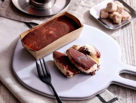 「ティラミス(2個)」では、コーヒーシロップを染み込ませたスポンジに、なめらかなマスカルポーネムースを重ねた。ほどよい苦味とやわらかな甘さが広がり、冷蔵ではやさしい口どけ、半解凍ではひんやりとした食感が楽しめる。香りを逃さず、後味に心地よい苦味が続く一品となっている。
