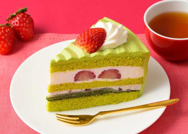 「苺の宇治抹茶ショート(求肥入り)」は、抹茶、粒あん、求肥などを組み合わせた、和テイスト満載のショートケーキ。ほろ苦く香り高い宇治抹茶の味わいに、適度な甘さの粒あんクリーム、苺の甘ずっぱさ、求肥のもちもち食感が一体化して生まれる、心和む味わいを楽しんでほしい考え。