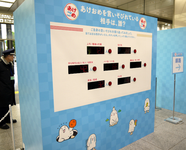 「あけおめいいそびれ集」の展示では、年始の挨拶(メッセージや年賀状)に関して起こりがちな、気まずい8つのシチュエーションをパネルで再現している。
