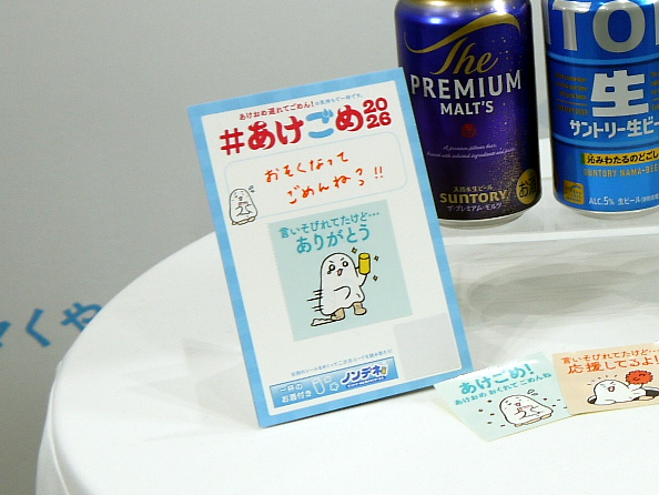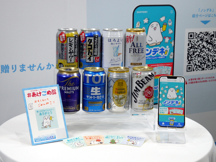 サントリーは、“人と人をつなぐ”というお酒の魅力を感じてもらうことを目的に、お酒ギフトサービス「ノンデネ」を提供している。今回、年始の挨拶をいいそびれた人向けに、1月7日から9日まで、年始の挨拶は今からでも遅くないことを呼びかける体験型イベント「#あけごめ by ノンデネ」をJR東京駅 八重洲中央改札外で開催する。初日に行われたプレス内覧会では、正月の松の内が終わるタイミングの1月7日から年賀イベントを実施する背景や狙いについて説明すると共に、会場のコンテンツ内容が公開された。