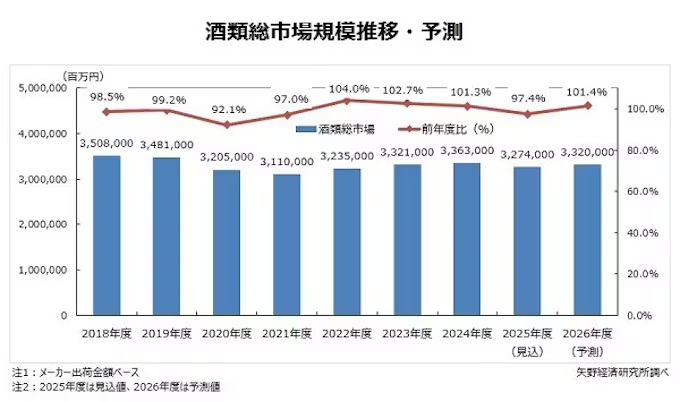 矢野経済研究所は、国内の酒類総市場を調査し、酒類分野(カテゴリー)別の動向、流通ルート別の動向、参入企業の動向、および将来展望を明らかにした。その結果、2024年度の酒類総市場は3年連続拡大するも、2025年度は縮小に転じる見込みであることがわかった。2026年のビール類酒税一本化を見据えた市場再編が加速する見通しであることも示唆した。