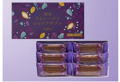 「銀座ラムレーズンショコラサブレ(6個入)」は、ベルギー産チョコレート&発酵バターを使用したショコラクリームに、2種のラム酒を使用した自家製ラムレーズンを合わせて、ほろ苦い味わいのココアサブレでサンドした。コク深いショコラクリーム、芳醇なラムレーズン、さっくりサブレの三位一体の贅沢な味わいを楽しんでほしいという。