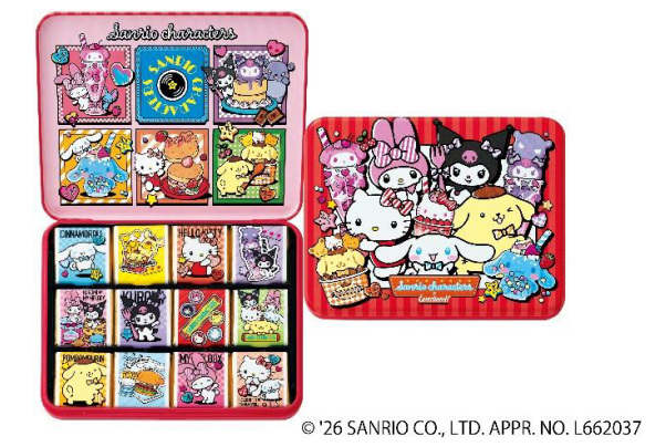 イトーヨーカドー・ヨーク・ヨークベニマル・イズミ限定「サンリオキャラクターズ×ゴンチャロフ サンリオキャラクターズ コレクター缶」は、クロミ、マイメロディ、ポムポムプリン、ハローキティ、シナモロールの様々なポーズを描いた、12種類の薄板型チョコレートを、キャラクターデザイン満載の蝶番缶に詰め合わせた。