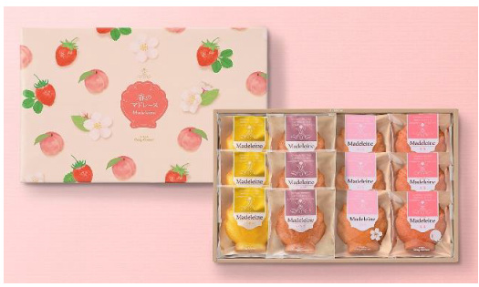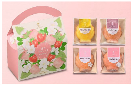 「春のマドレーヌ」は、岡山県産の桃「白鳳(はくほう)」の芳醇な甘み&香りが広がる「ももマドレーヌ」、ふわりとさくらが香る「さくらマドレーヌ」。あまおう苺の甘ずっぱさと華やかな香りの「いちごマドレーヌ」、国産バターとたっぷりの卵を使ってしっとり焼き上げた「バターマドレーヌ」。「いちご」「もも」「さくら」をデザインした春らしいパッケージにアソートした。