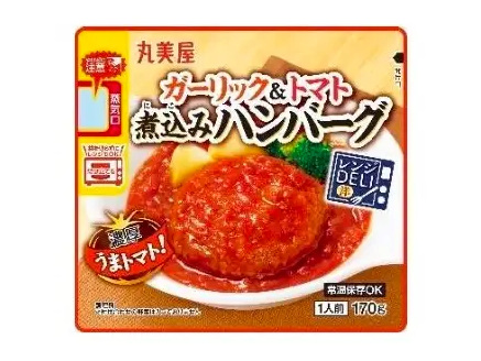 「レンジDELI<ガーリック&トマト煮込みハンバーグ>」は、ハンバーグとガーリック風味のトマトソースを圧力釜で煮込んだ。ガーリックの旨味とトマトの酸味がクセになる味わいとなっている。