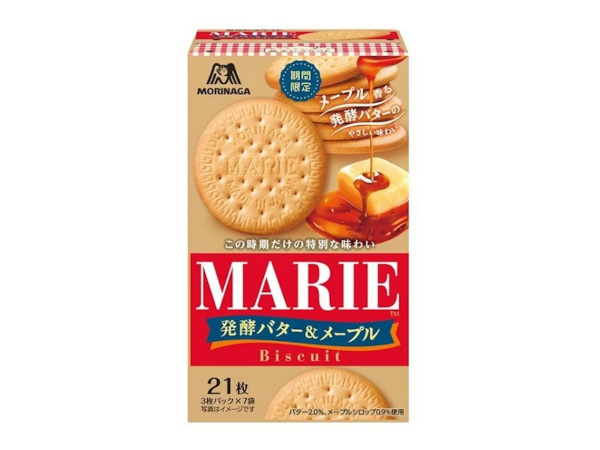小麦の香ばしさとミルクの味わいを生かしたシンプルでやさしい味わいのビスケット「マリー」は、1923年の発売以来、親から子へ、そして孫へと3世代を超えて多くの人々に支持されている。今回発売する「「マリー<発酵バター&メープル>」は、「マリー」ならではのミルクの風味とサクサク食感はそのままに、甘いメープルの香りと、発酵バターがもたらすやさしいコクを重ねた、冬のティータイムにぴったりの味わいに仕立てた。口に入れた瞬間からふわりとメープルの甘い香りが広がり、食べ進めていくにつれて感じる発酵バターのやわらかなコクが織りなす、少し濃いめの満足感あるおいしさが特長となっている。