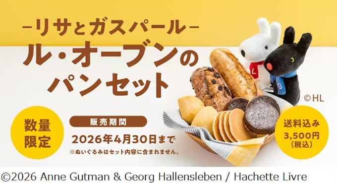 「『リサとガスパール』ル・オーブンのパンセット」では、フランスの人気絵本キャラクター「リサとガスパール」と、本格派冷凍パン「L'Oven(ル・オーブン)」が夢のコラボ。5種類のパンを厳選して詰め合わせた、数量限定のセットになっている。同パンセットを購入した消費者には、もれなくリサとガスパールのバターナイフをプレゼント。赤(リサ)または青(ガスパール)のいずれか一つをランダムで届ける。
