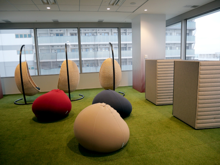 「RECHARGE SPOT」では、人工芝にヨガマットやリクライニングチェアを設置し、仮眠やストレッチなどで心身のリフレッシュをサポート。カーテンなどを活用してプライベートな空間を創出している。